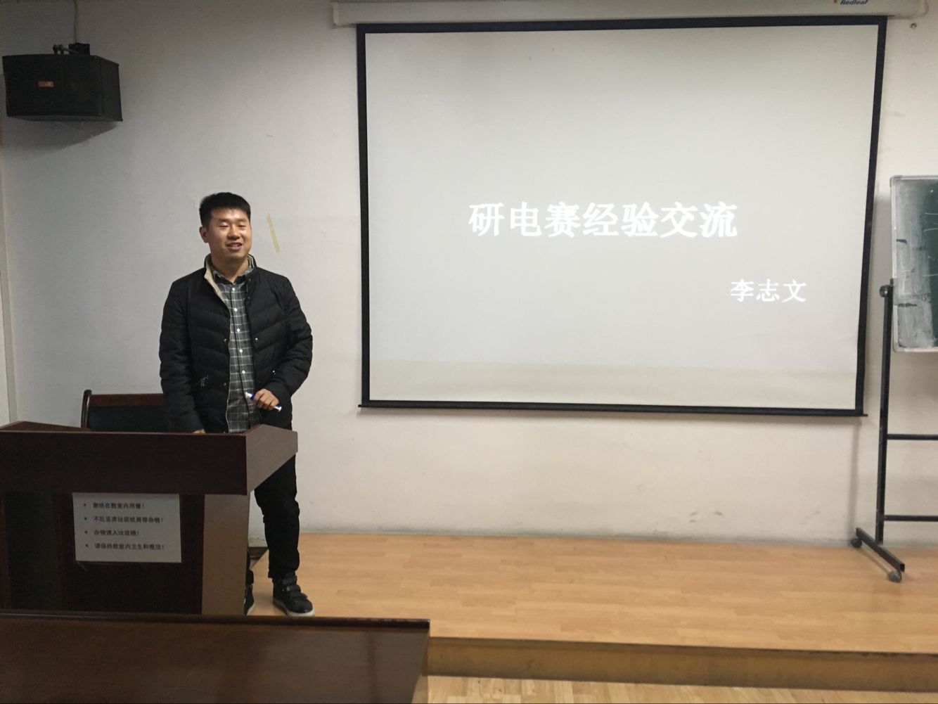 两位博士精彩报告结束后,由五位优秀的研究生代表对全体同学作学习经验交流。首先,李志文同学从公司队伍获奖情况鼓励同学们积极参加竞赛,并向大家介绍了参赛报名流程。接着,李明同学结合自己的研究课题阐述了基于机器视觉的物体表面缺陷检测平台可以实现实时多目标识别。随后,杨曼同学介绍了自己研究的课题——基于Kinect三维点云重建的实现与应用,分别通过基于方法库的点云去噪算法、基于散点云的精速算法和基于ISS特征点结合改进ICP的点云配准算法三个环节寻找可以同时对多个角度局部点云模型进行快速、高效地配准与拼接。然后,田瑜同学通过自主移动巡逻、区域视频安保、人脸识别、高清语音对讲几个方面,向同学们介绍了人工智能与双目视觉的实际应用。最后,周显礼同学也介绍了他的研究方向——紫外光移动自组网节点设计及通信性能分析。五位同学的分享简洁明了,获得了现场热烈的掌声。