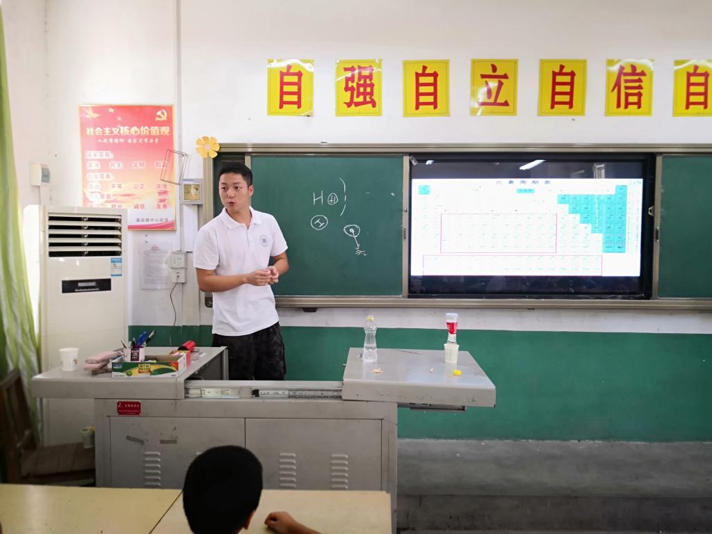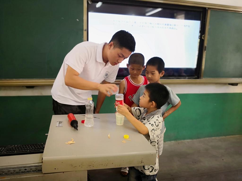 在科学实验课上,实践队员们用科学小实验吸引着孩子们的注意。他们一边实验,一边讲解,通过讲解示范将枯燥乏味的文字变得通俗易懂,小朋友们听得津津有味,还提出了自己的疑问,实践队员们都耐心仔细地聆听并回答了孩子们的问题。科学文化从物理、化学、生物三个方面讲解,扩增了小朋友的知识面,提高了他们对科学探索的兴趣,促使他们从小养成爱动脑、勤思考的好习惯,使他们今后可以更好地学习科学文化知识。