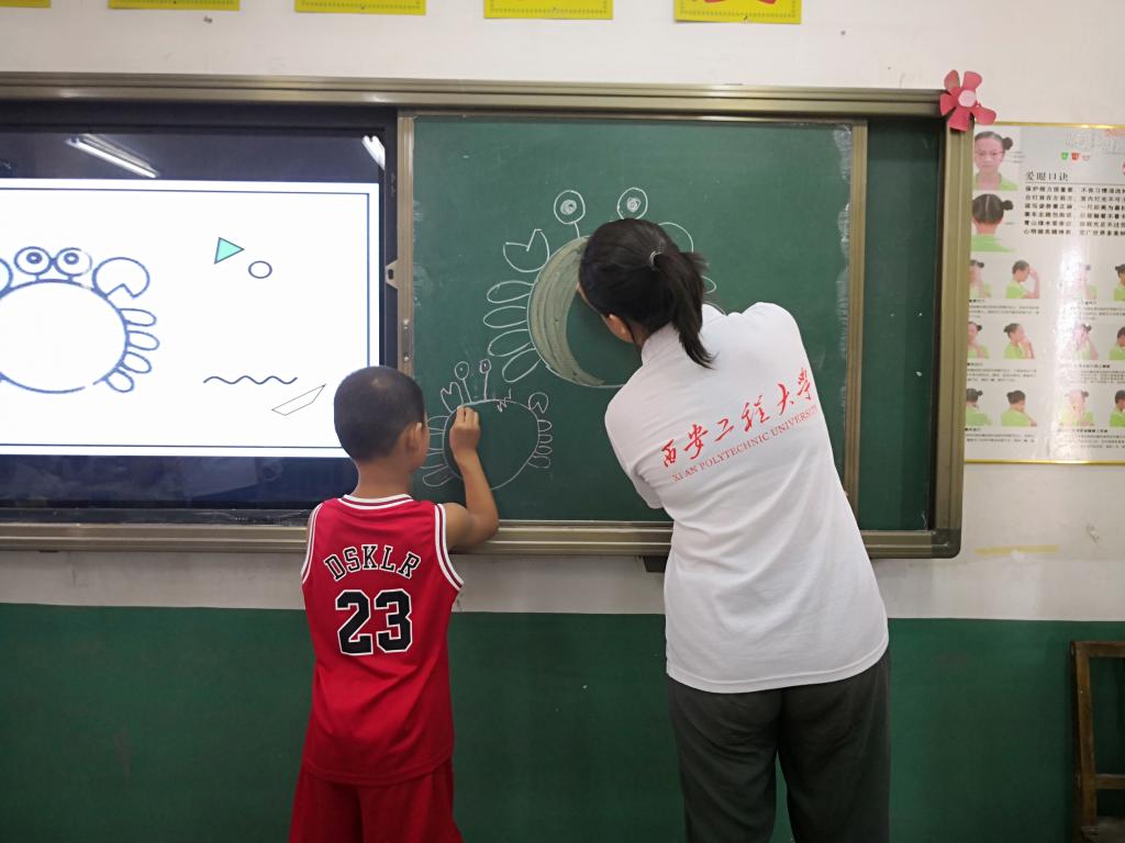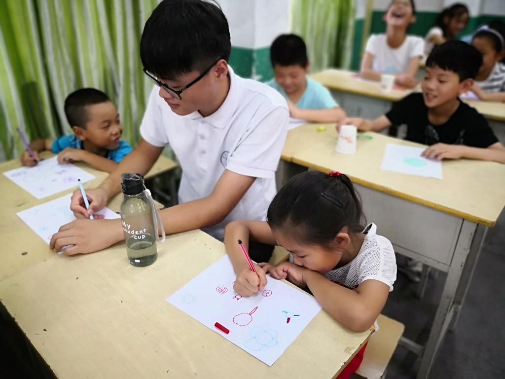 绘画课要开始了,实践队员们为孩子们分发了提前准备的纸张和彩笔,看到绘画课能够让这些平时美术课形同虚设的孩子们体验到绘画的乐趣,实践队员们从心里为这些孩子高兴。由于孩子们的层次不一,实践队员们从简单的图形入手,让孩子们根据圆形和正方形联想可以画出的东西,当问到有没有小朋友可以上讲台画的时候,孩子们争先恐后的举起了自己的小手,他们的眼睛都在说着“让我来画”,整个课堂气氛异常活跃。孩子们天马行空的想象力让实践队员们感到惊讶,大抵是无忧无虑的童年让他们保持了那份童真,才使得他们的想象力如此丰富。祝愿他们在以后的每一天都可以这样开心,快乐下去。