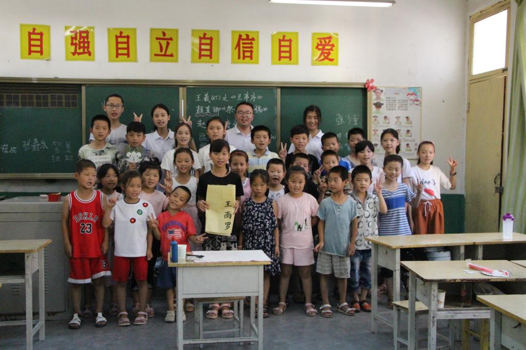 第二节是书法课,实践队员们采用抢答的课堂形式和手把手的教学模式,带领孩子们学习书法文化。孩子们对书法的热情让人出乎意料。从孩子们的口中,实践队员们了解到之前灰堆坡小学从未开设过书法课,他们高涨的情绪深深触动了支教的实践队员们,课程结束后孩子们对书法产生了浓厚的兴趣,为了让队员们用毛笔书写他们的名字,孩子们排队着等候,迟迟不愿回家。这次书法教学既让孩子们了解到书法历史文化发展,又让孩子们学到了一些书写毛笔字的技巧与方法,让他们有了一次别样的书法学习的经历。