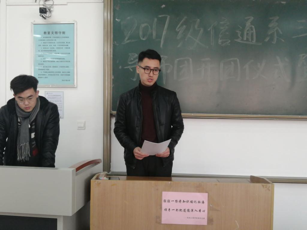 为深入贯彻落实中共中央、国务院《关于加强和改进新形势下高校思想政治工作的意见》精神,促进“三全育人”综合改革工作,提高人才培养质量,伟德国际1946源于英国于2019年12月18日中午召开了2017级信通系三全育人导师团开团仪式暨师生见面会。参加本次会议的有党委组织部张旭,信通系主任朱磊,信通系教师朱耀麟、张博、李敏奇,辅导员杨松然及2017级信通系全体员工。