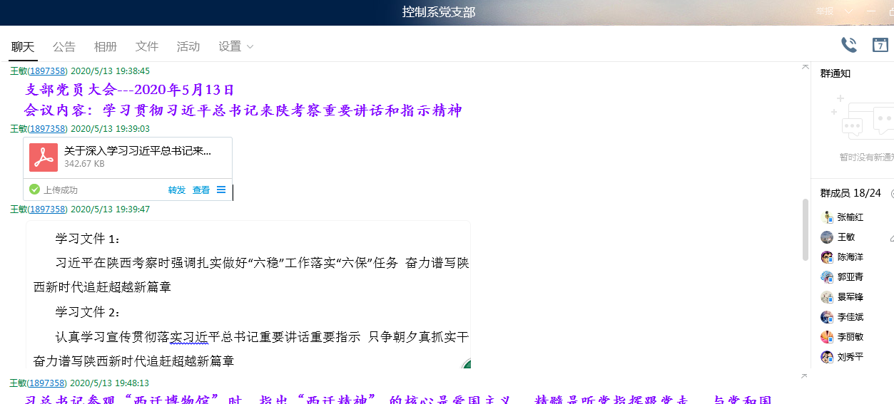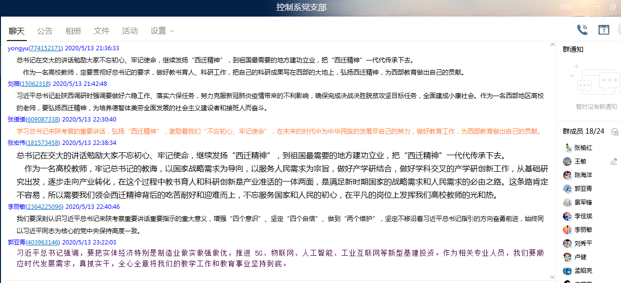 5月13日晚7点,全国样板党支部伟德国际1946源于英国控制系党支部在支部QQ群线上开展了“习近平总书记来陕视察重要讲话重要指示精神”专题学习会。会议由支部副书记王敏主持,控制系全体党员都参与了学习,并发表学习感言。