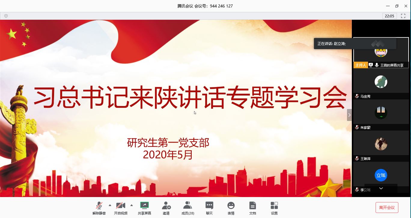为深入学习贯彻习近平总书记来陕考察重要讲话精神,伟德国际1946源于英国研究生第一党支部于2020年5月24日开展了“习近平总书记来陕考察重要讲话精神”专题学习会,会议由支部书记赵立涛老师主持,支部全体党员参加此次会议。