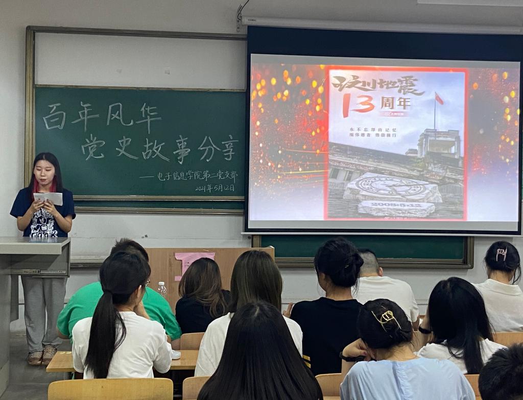 杨凯同志向大家分享了贺龙从军的故事。他讲到,贺龙是中国人民解放军的创始人和主要领导者之一,他在中国的军事领域做出巨大的贡献,从而激励大家以更加饱满的热情以及更加昂扬的状态不断提升自己的激情干劲。杜天同志讲述了党员赵梦桃的故事。她深情的讲到,赵梦桃自16岁便进入西北棉一厂工作,一干便是11年,在这11年里,她一直为纺织行业改革创新、增产增效做贡献,是那个年代全国纺织行业的一面旗帜,“高标准、严要求、行动快、工作实、抢困难、送方便”的梦桃精神激励着我们后辈砥砺前进。黎长淼同志讲述了无私照顾残疾邻居的共产党员谢秀英的故事,这位女共产党员48年如一日,尽心尽力、没有半句怨言地照顾整日卧床不起的邻居杨龙南。乔沫同志分享了汶川地震灾害中的感人故事,他讲到:“即使2008年的汶川地震已经过去了13年,十几年翻天覆地的变化,让汶川再也找不到地震时留下的痕迹。但是,灾害中英雄人物的事迹和精神,值得每一位年轻党员熟知并传承。”
