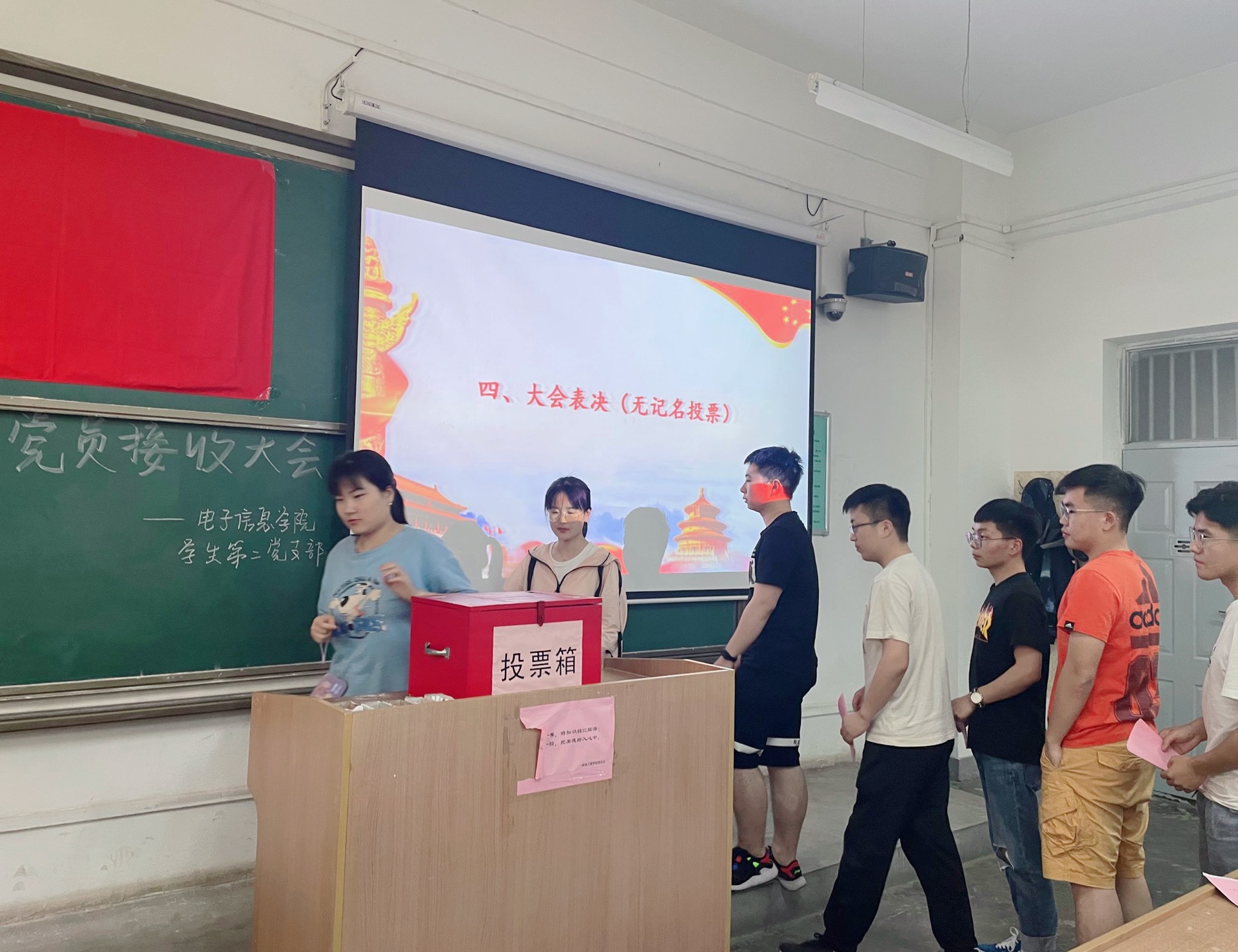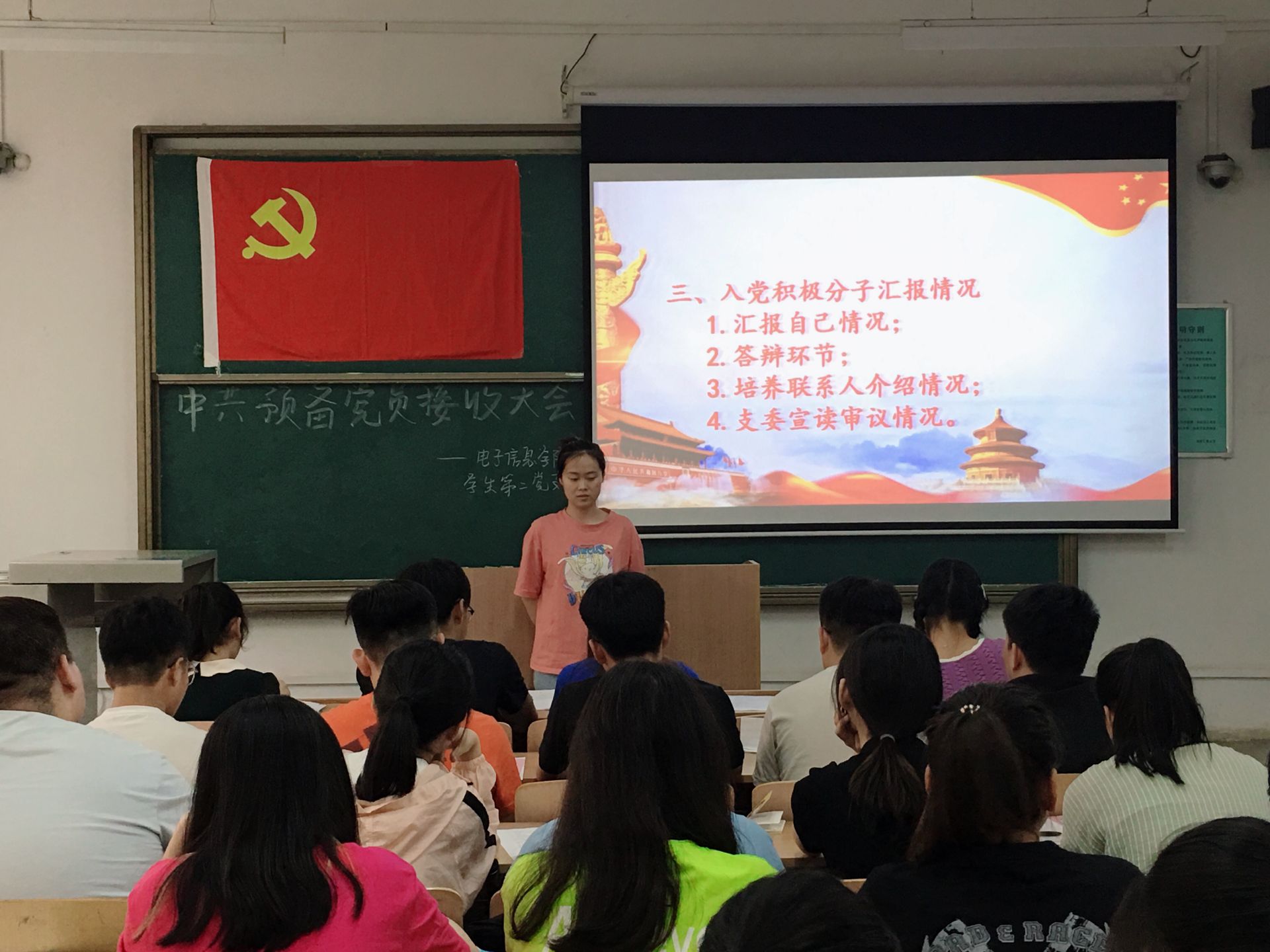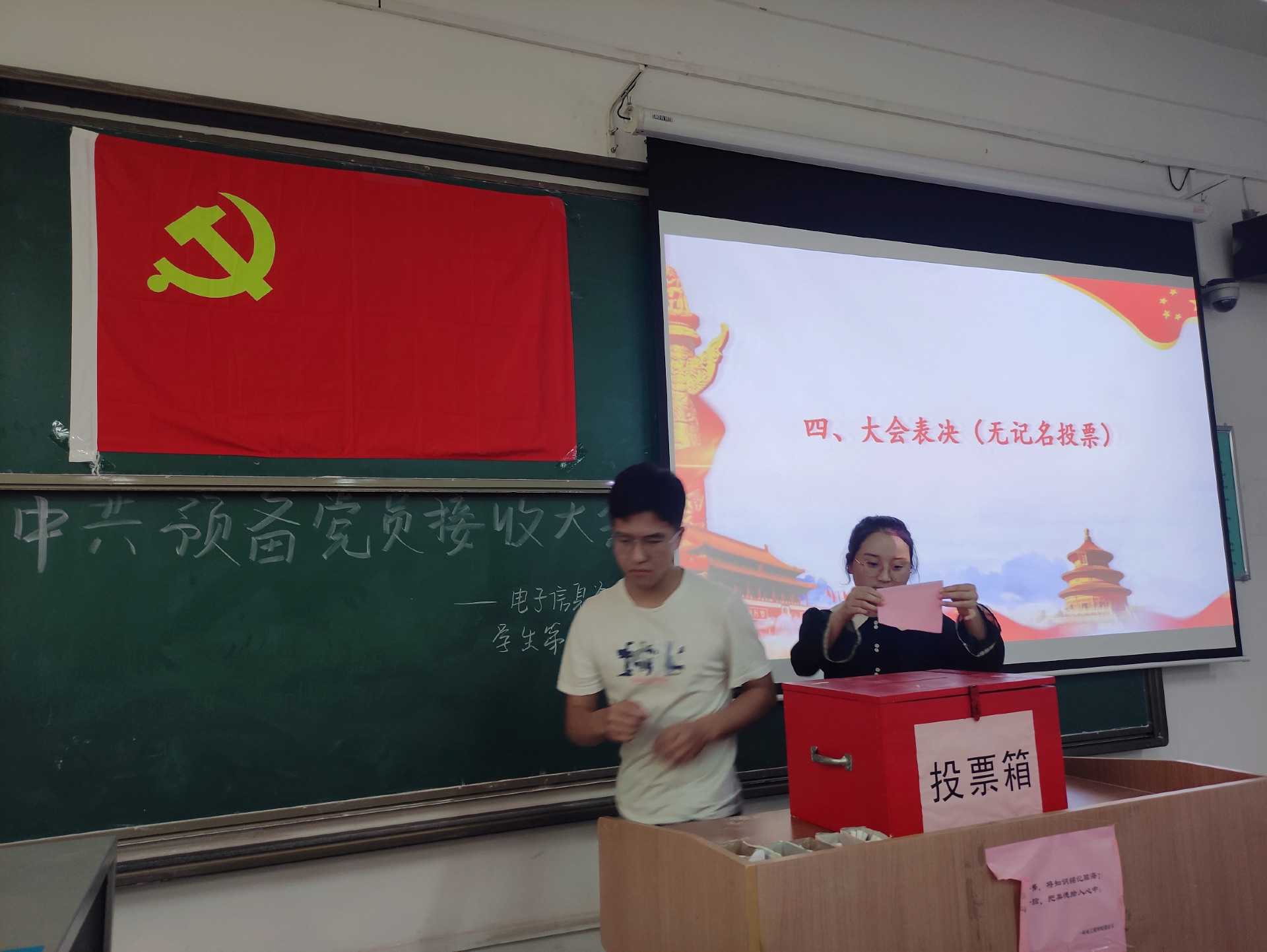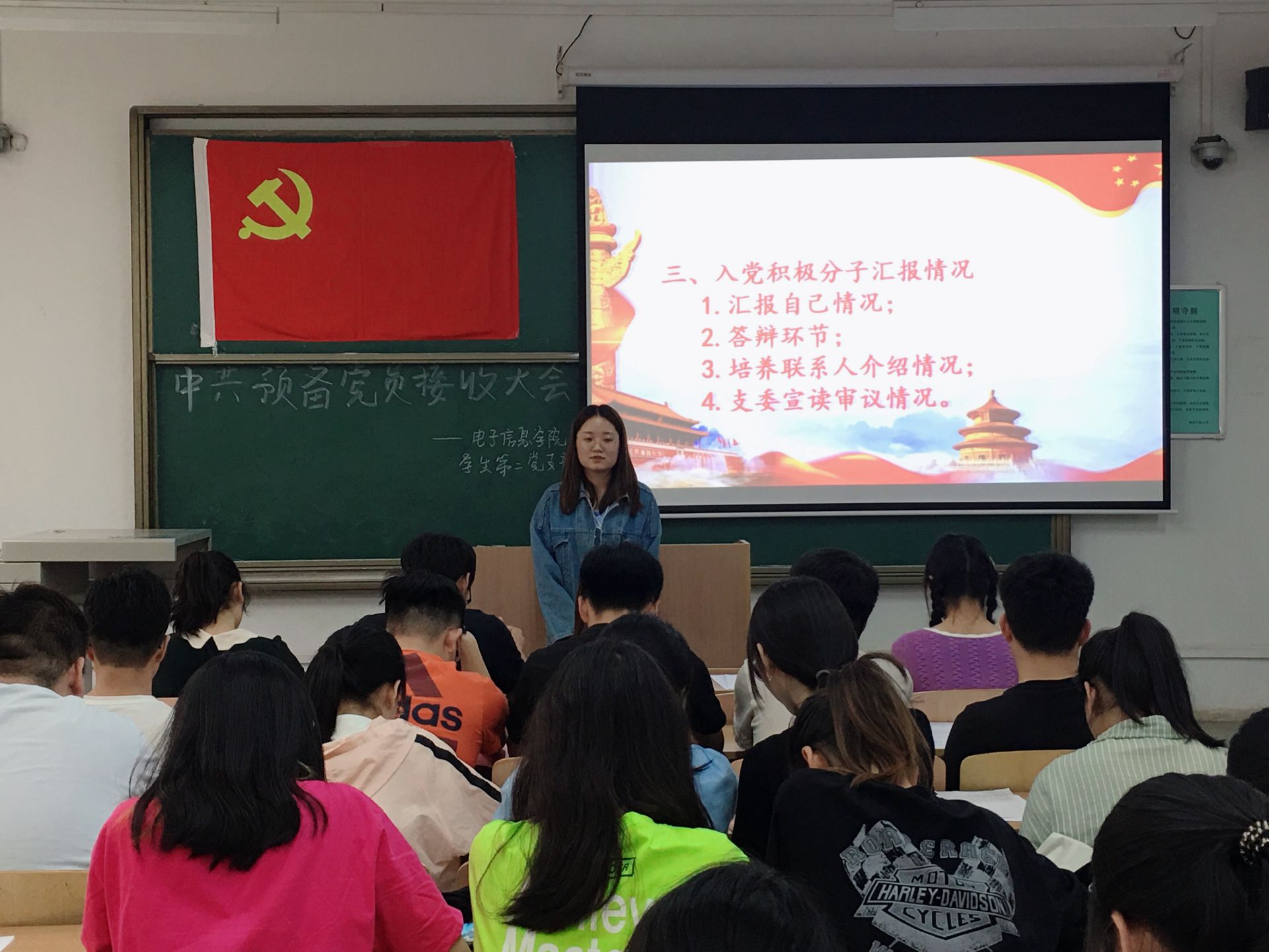 王洁、王浩等17名发展对象依次上台发言,从思想态度、生活、学习、工作等方面汇报了自己的实际情况,同时表达自己加入中国共产党的态度和决心,并认真回答了正式党员提出的问题。之后,各位发展对象的入党介绍人分别对他们作出总结性评价,介绍其在思想、学习、生活、工作上的优缺点,并表达了是否建议接收为预备党员的观点。支部全体正式党员综合考虑各发展对象的表现,进行无记名投票,经大会投票表决,王洁、王浩等17名同志全票通过支部大会讨论,接收为中共预备党员。
