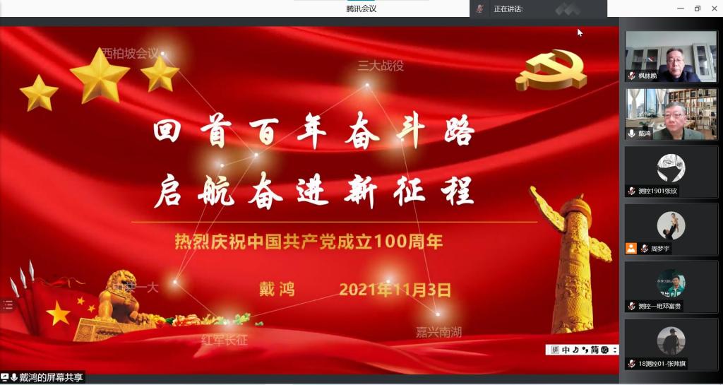 戴鸿以“回首百年奋斗路,启航新征程”为题,以时间为脉络,讲授了党的百年奋斗史,从新民主主义时期、社会主义革命和建设时期以及改革开放社会主义现代化建设时期这三个时期讲述中国共产党的发展,回首百年的艰辛与辉煌,从一大到十九大再到现在的百年征程,中国共产党走过了整整一百年的历程,这是用鲜血、汗水、泪水、勇气、智慧和力量写就的百年,是披荆斩棘、艰苦创业、砥砺前行、充满艰险的百年,逐步实现救国兴国富国强国的奋斗目标,是中国共产党百年的庄严使命。