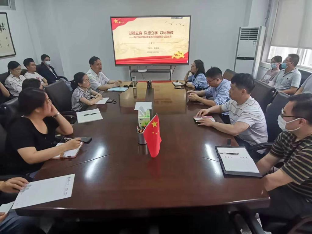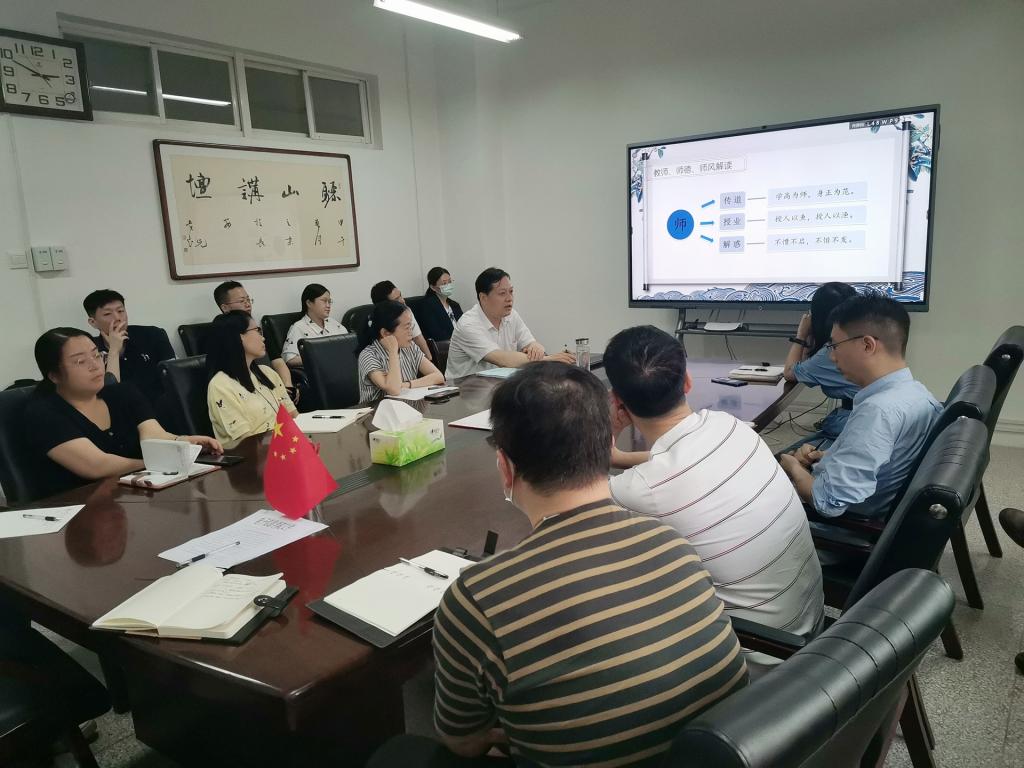 为加强师德师风建设,引导广大教师不忘立德树人初心,牢记为党育人、为国育才使命,5月25日,在电信楼414会议室,电子信息公司党委书记杨友谊为公司青年教师作了题为《抓师德师风建设,做四有好老师》的精彩报告,公司青年教师20余人共同聆听了报告。在正式讲授之前,杨友谊带领老师们学习了《十九大以来陕西省高校违纪违法典型案例警示录》,重点解读了涉及教师行为失德、科研经费使用不当等案例,要求教师要以案为鉴、以案为戒,始终恪守职业行为准则,始终坚持自我革命,始终保持清醒头脑,绝对不逾越和触犯“师德底线”,必须遵循“师德基准。