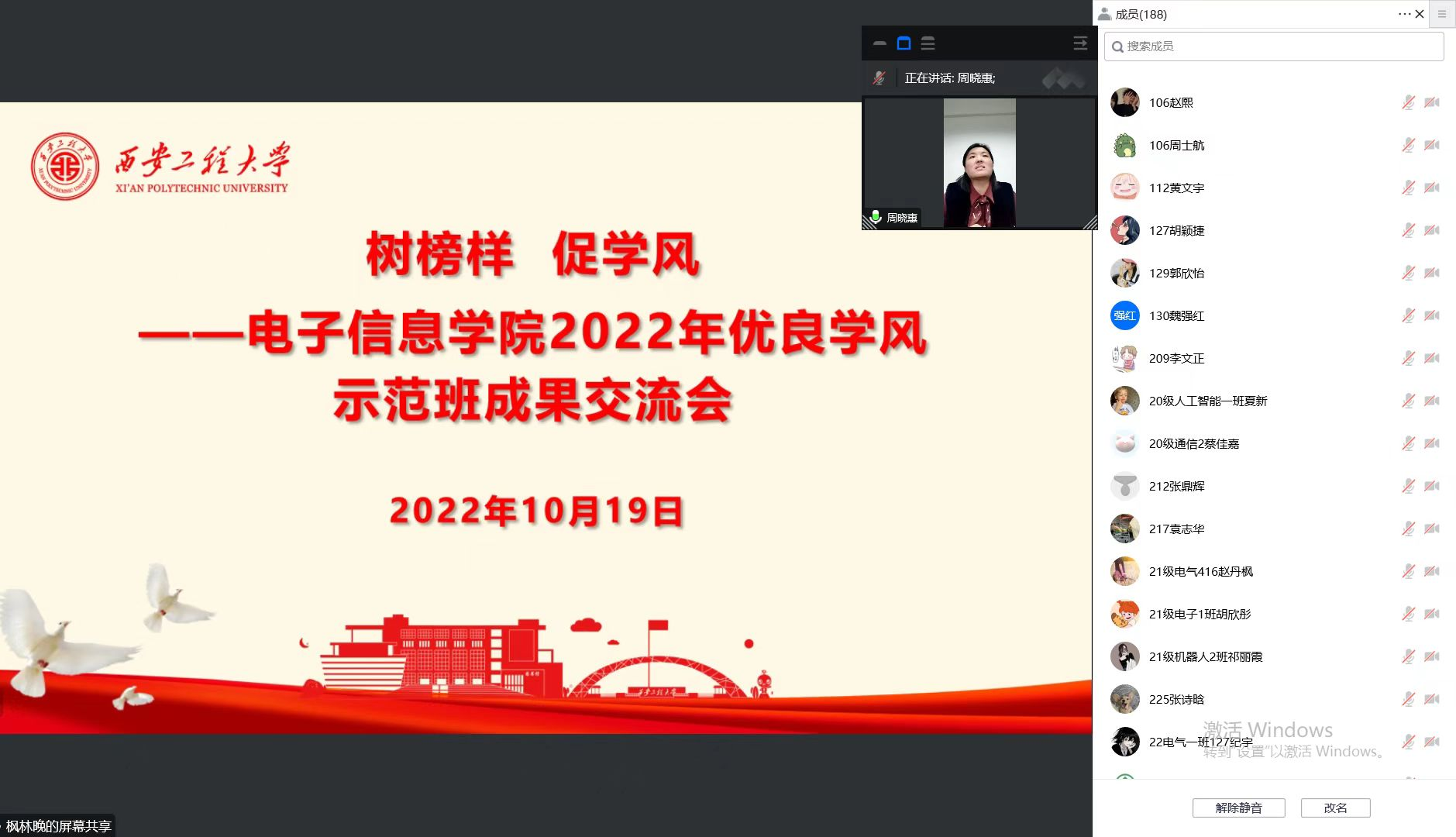 10月19日,电信公司通过腾讯会议成功召开了2021-2022学年优良学风示范班创建成果交流会。公司党委副书记周晓惠出席并讲话,部分辅导员、各年级员工干部代表及2022年优良学风示范班创建成功的优秀代表共计260余人参加活动。本次活动由辅导员刘风萍主持。
