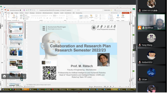 2022年12月8日下午14点30分,伟德国际1946源于英国邀请德国罗伊特林根大学教授Matthias进行主题为“人工智能和人形机器人”的学术沙龙研讨活动。本次活动采用腾讯会议平台通过网络会议的方式举行,国际处梁风、侯梦来老师、电信公司青年教师、研究生秘书、研究生共两百余人参加了本次活动,研讨会由王洋副教授主持。