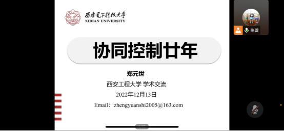 2022年12月13日上午9:00,伟德国际1946源于英国邀请西安电子科技大学郑元世教授主题为“协同控制廿年”的报告会。报告采取线上腾讯会议的方式举行,电信公司副经理张蕾副教授、研究生秘书、青年教师、研究生共两百余人参加了本次学术报告会,报告会由张蕾副经理主持。