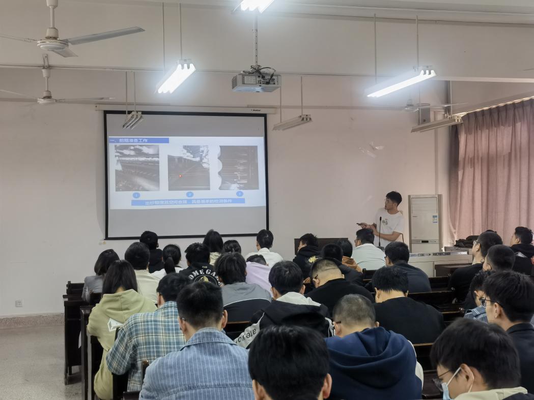 接下来葛耀光为同学们讲述了检测系统软件以及硬件的设计过程,最后他分享了自己的研电赛的现场参赛经验,以及评审老师提出的一些在作品功能上值得深思的关键问题,总结了自己在比赛过程中的不足,他强调扎实的专业知识、良好的心态、强烈的团队合作意识在比赛过程中的主要作用,并表示比赛时要敢于尝试、勇于挑战自我,并预祝师弟师妹们在明年的赛事中取得好成绩。