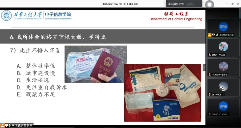 最后,李老师分享了目前在荷兰做访问学者的一些经历和感受,把国外的本科教学与员工的学习状态和国内进行对比,虽然教学模式有差异,但是我们的教育资源丝毫不比国外落后,告诫同学们要学习其良好的契约精神和自律的品质,这样才会获得丰硕的科研成果。李老师感慨“此生不悔入华夏”,尤其是疫情期间,祖国和公司的问候和支援让他格外感动,同学们都感同身受。