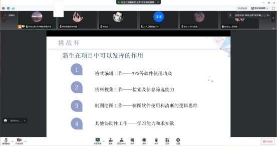 周晓惠强调,本届竞赛中要继续发扬公司重视科技创新,培养员工竞赛能力的优良传统,做好“老带新”传帮带团队成员结构的构建,帮助同学与团队、同学与老师搭建桥梁,延续公司积极竞赛的热烈氛围。杨松然为同学们分析了“挑战杯”的价值,用以往指导员工参赛的经历说明了“参加挑战杯需要什么?”、“我能从其中获得什么?”、“怎么参与挑战杯?”等关键问题。