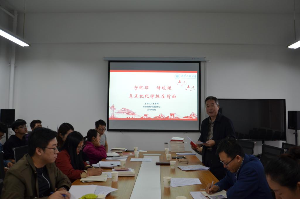 杨恩科首先带领大家集体学习了《中共中央关于加强党的政治建设的意见》和新修订的《中国共产党问责条例》,与会人员结合个人思想工作情况,全面查找了问题和差距。随后,杨恩科做了题为《守纪律,讲规矩,真正把纪律教育挺在前面》的纪律教育党课,他从五个方面进行了讲授:一是要去认真守纪律、讲规矩,在任何时候都把纪律挺在前面,是我们党加强党的建设的重要经验;二是面对新形势新任务,真正做到“把纪律挺在前面”更具重要性和紧迫性;三是准确把握党的纪律规矩的科学内涵和精神实质,增强“把纪律挺在前面”的自觉性和坚定性;四是守纪律,讲规矩,把纪律挺在前面,就是要在思想上和行动上坚决维护党章的权威性和严肃性;五是要在守纪律、讲规矩,坚持把纪律挺在前面上做表率,成为政治上的明白人。