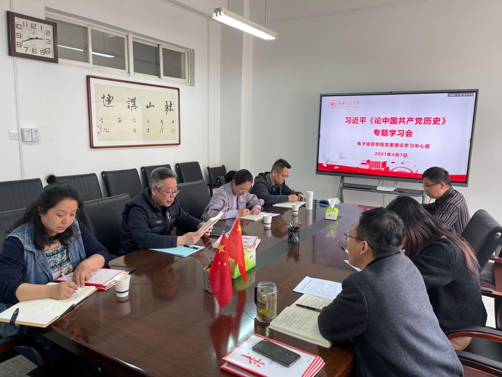 2021年4月7日下午14:30,电子信息公司党委理论学习中心组在电信楼414会议室召开学习会,集体研学习近平同志《论中国共产党历史》,会议由公司党委书记杨恩科主持。学习会以领学与研学相结合的方式进行。