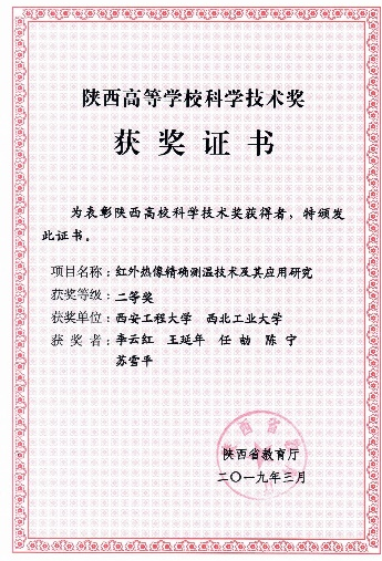 | 2 | 红外热像精确测温技术及其应用研究 | 陕西省高等公司科学技术二等奖 | 陕西省教育厅 | 2019.3 | 王延年 |