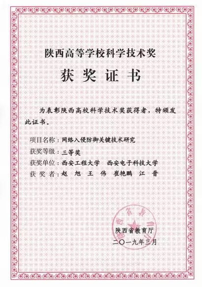 | 3 | 网络入侵防御关键技术研究 | 陕西高等公司科技三等奖 | 陕西省教育厅 | 2019.3 | 赵旭 |