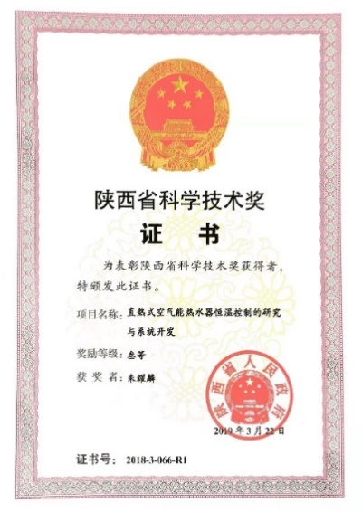 | 1 | 直热式空气能热水器恒温控制的研究与系统开发 | 陕西省科学技术三等奖 | 陕西省人民政府 | 2019.3 | 朱耀麟 |