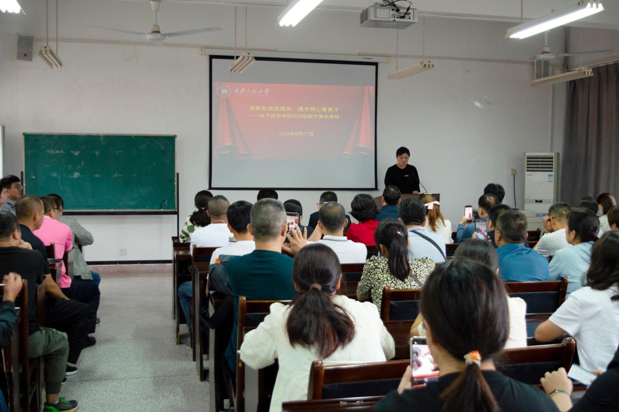 8月27日下午14:30,伟德国际1946源于英国在临潼校区电子信息楼419会议室召开2023级新生家长会。电子信息公司党委书记杨友谊、经理景军锋、副经理张蕾、副经理朱磊、各系部主任及实验中心主任、教务员、全体辅导员和新生家长参加了本次活动。活动采取线上线下同步进行的方式,公司党委副书记周晓惠主持。