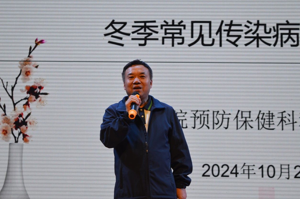 杨军宏从冬季传染病特点、冬季常见校园传染病防控、常见传染病的预防措施三个方面为师生进行了专业详细的讲解,重点讲解了简单有效的预防措施,指出有效做好控制传染源、切断传播途径、保护易感者工作,才能更好地预防秋季校园各类易发传染疾病。最后,杨军宏倡议同学们要保持健康生活习惯:规律作息、充足睡眠、健康饮食、适量运动,希望全体员工保持个人卫生,增强自身抵抗能力。