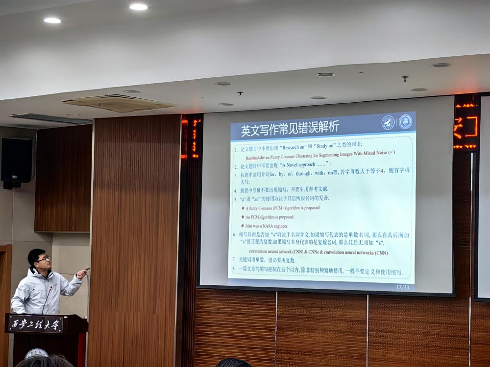 王聪副教授从科研论文写作与投稿的规范入手,强调了规范对于科技论文的重要性。他指出,科研论文不仅需要严谨的逻辑和高水平的研究成果,还需要规范的写作和准确的语言。王老师详细介绍了科研论文的主要部分,包括摘要、引言、方法、实验结果等,他强调每个部分的逻辑性和一致性能够增强文章的整体信服力,建议研究生在英文写作时应该遵循国际通用的写作格式,避免常见的英文写作错误。
