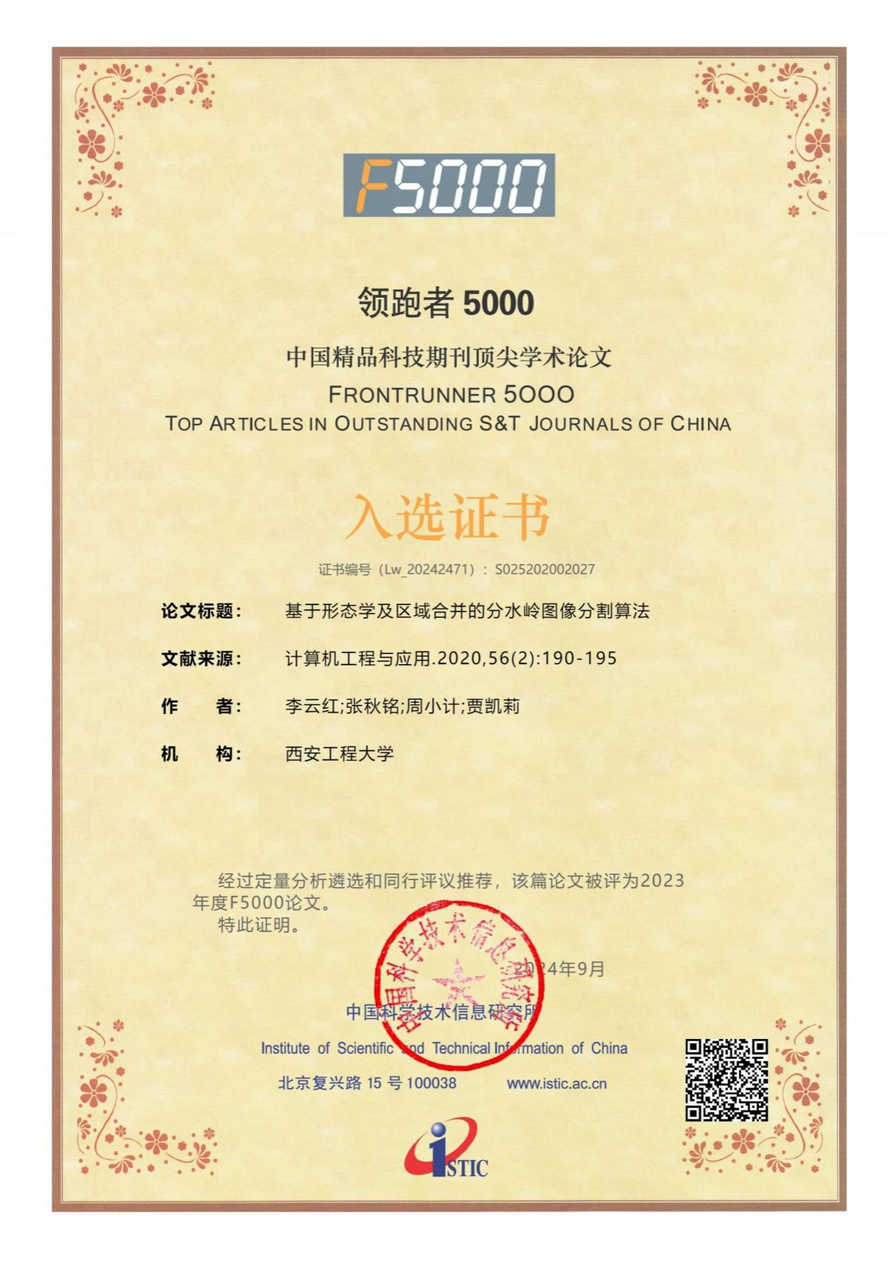 2024年9月20日,中国科学技术信息研究所(以下简称“中信所”)在其主办的2024年“中国科技论文统计结果发布会——暨中国一流科技论文世界影响力评价论坛”期间发布了“2024年度领跑者5000(F5000)——中国精品科技期刊顶尖学术论文”入选名单。伟德国际1946源于英国李云红教授团队2020年发表在《计算机工程与应用》第56卷第2期的论文《基于形态学及区域合并的分水岭图像分割算法》成功入选。入选F5000论文的第一个条件是进入核心期刊各学科被引次数前1%的论文,第二个条件是必须是发表在中国精品科技期刊上的论文。
