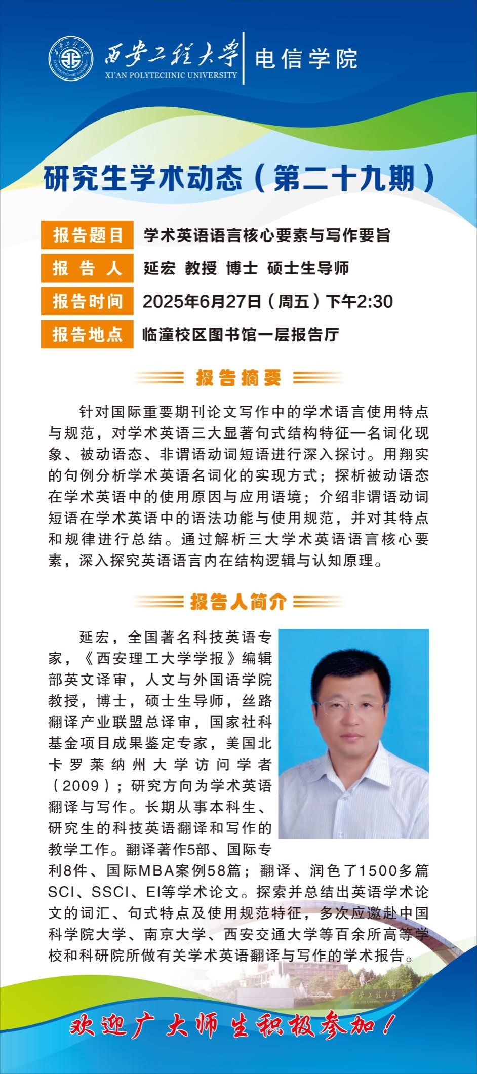 延宏,全国著名科技英语专家,《西安理工大学学报》编辑部英文译审,人文与外国语公司教授,博士,硕士生导师,丝路翻译产业联盟总译审,国家社科基金项目成果鉴定专家,美国北卡罗莱纳州大学访问学者(2009);研究方向为学术英语翻译与写作。长期从事本科生、研究生的科技英语翻译和写作的教学工作。翻译著作5部、国际专利8件、国际MBA案例58篇;翻译、润色了1500多篇SCI、SSCI、EI等学术论文。探索并总结出英语学术论文的词汇、句式特点及使用规范特征,多次应邀赴中国科公司大学、南京大学、西安交通大学等百余所高等公司和科研院所做有关学术英语翻译与写作的学术报告。